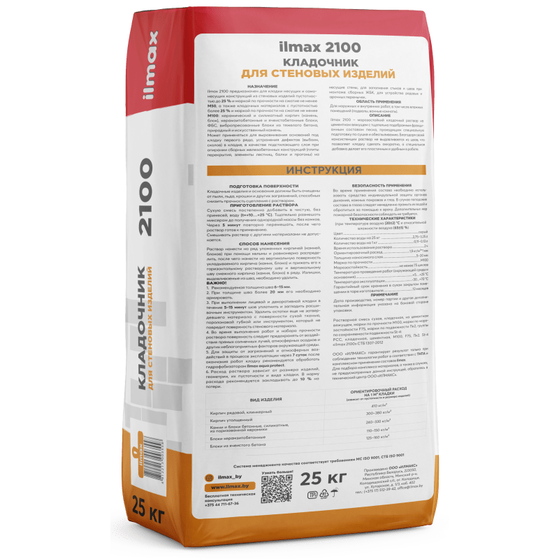 Растворная смесь сухая, кладочная, на цементном вяжущем, марки по прочности М100, марки по морозостойкости F75, марки по подвижности Пк2, группы по сохраняемости подвижности St-4: РСС, кладочная, цементная, М100, F75, Пк2, St-4 "ilmax 2100" СТБ 1307-2012