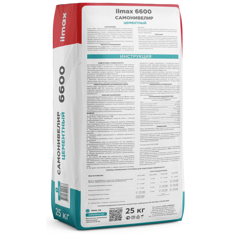 Растворная смесь сухая для самонивелирующихся стяжек, на цементном вяжущем, марки по прочности М200, марки по подвижности Пк4, группы по сохраняемости подвижности St-1:РСС для самонивелирующихся стяжек, цементная, М200, Пк4, St-1 "ilmax 6600" СТБ 1307-2012