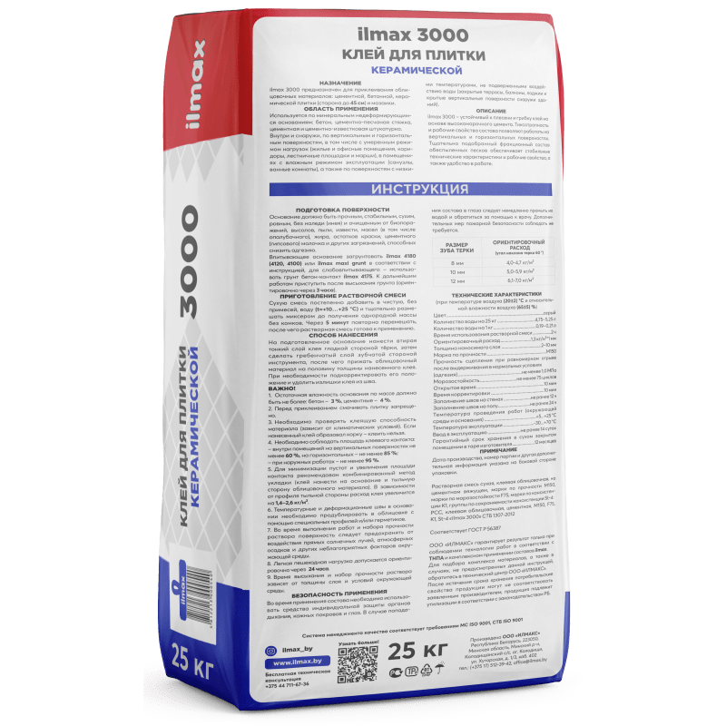 Плиточный клей ilmax 3000 предназначен для приклеивания керамической плитки размером до 40x40 см, керамической мозаики, а также цементных, бетонных плиток толщиной не более 10 мм. Используется на жестких (недеформируемых) впитывающих основаниях из следующих материалов: бетон; цементные и цементно-известковые штукатурки; кирпич и блоки из ячеистого бетона; цементные стяжки.