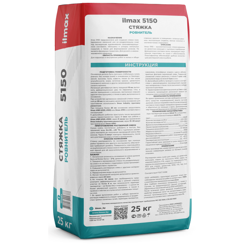 Растворная смесь сухая для стяжек, на цементном вяжущем, марки по прочности М150, марки по морозостойкости F75, марки по подвижности Пк2, группы по сохраняемости подвижности St-2: РСС для стяжек, цементная, М150, F75, Пк2, St-2 "ilmax 5150" СТБ 1307-2012