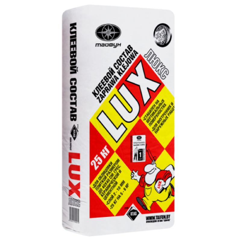 Клеевой облицовочный состав Тайфун Люкс, 25 кг (Беларусь) хороший выбор для облицовки горизонтальных и вертикальных поверхностей плиткой в помещении и снаружи. Данный клеевой состав позволит Вам клеить плитку во влажной среде. После того как состав будет готов к работе, все его клеевые свойства будут активны в течении двух часов. Нежелательно использовать данный клеевой состав в облицовке печей, бассейнов, каминов.