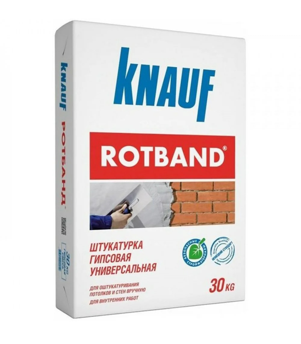 Штукатурка гипсовая КНАУФ Ротбанд 30кг, Беларусь - универсальная гипсовая сухая штукатурная смесь с добавками, обеспечивающими повышенную адгезию. Она предназначена для оштукатуривания вручную стен и потолков с любым типом поверхности (бетон, кирпич, пенополистирол и т.п.) внутри помещений с нормальной влажностью, включая кухни. Продукция Кнауф Ротбанд высокого качества. В продаже Rotband - одна из наиболее популярных гипсовых штукатурок. Средний расход: при слое 1 см мешок 30 кг - 3,5 м. кв.